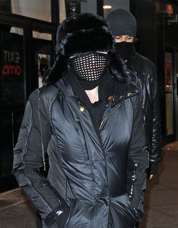 这两个穿了夜行衣的神秘人是谁?麦当娜和小男友吉瑟斯·鲁兹相约看电影。两人都以黑装示人,压低帽沿蒙面不牵手,造型雷人。麦当娜更是戴着黑色雷锋帽、黑色镂空口罩,红唇隐现,这是约会还是做贼?