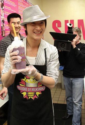 中新网3月25日电 因解约事件而有一段时间没有公开露面的Super Junior中国籍成员韩庚,近日现身美国洛杉矶某知名奶昔店,制作以自己名字命名的奶昔产品“韩庚舞动奶昔”。