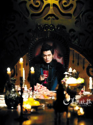 在新专辑预售海报上,周杰伦以一个中古世纪的吸血鬼扮相出现。只见他脸色苍白,嘴唇鲜红,穿一身西装外套,还罩了一件羽毛披肩,坐在餐桌前若有所思,像是一个住在城堡中的神秘“吸血鬼王子”。造型师还在周杰伦的指甲贴上带有铆钉的指甲片,让握着酒杯的手流露出华丽感;眼睛里则戴上了特殊的隐形眼镜,营造出一双“电眼”,眼里还有动物般的直立椭圆瞳孔,诡异得令人战栗。