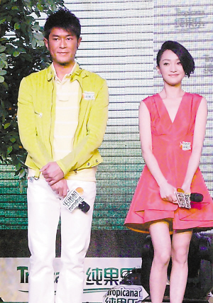 昨天在北京三里屯Village举行的活动中,除了周、古两人亮相外,正在成都筹备个唱的许巍也发来VIDEO,演唱了他为纯果乐打造的主题曲《晨星》。为配合品牌的多彩颜色,古天乐和周迅分别以翠绿休闲装和橙色短裙亮相,他俩一上台就隔得远远的,在回答各自对对方的感觉时,古天乐很无厘头地赞周迅“是个好人”,“她很年轻”,周迅则称古仔“很幽默”。在主持人的带领下,两人回忆了各自的童年趣闻和从艺经历,可惜两位代言人却始终没有交流。