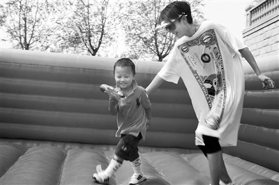 “平时真没时间这么陪他玩,今天(2日)是他的生日,怎么也得好好陪陪他。”孙悦喘着气说。她刚把水枪放下,小儒生又跑了过来,拉着她上气垫床上玩。