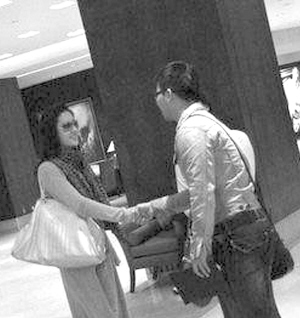 那名男子看到刘亦菲后,很礼貌地与之握了一下手,刘亦菲的表情略显拘谨。