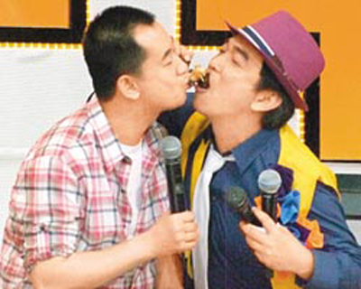 前晚两人上《我猜我猜我猜猜猜》,介绍台湾夜市很红的小吃“海怪级章鱼脚”,吴宗宪喂黄海波吃,但怕他咬不断,主动用嘴巴帮忙咬,差点男男吻。昨晚海清录中视《新闻6一下》,体验当主播,大叹当主播比演戏难太多。