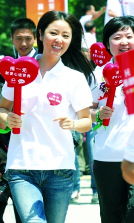 1日,中国扶贫基金会倡议全社会一人捐一元钱 ,用于为灾区小学生提供一年的每日营养加餐。图为著名影星林心如通过跑步的形式呼吁为灾区小学生捐款。 苏冠名