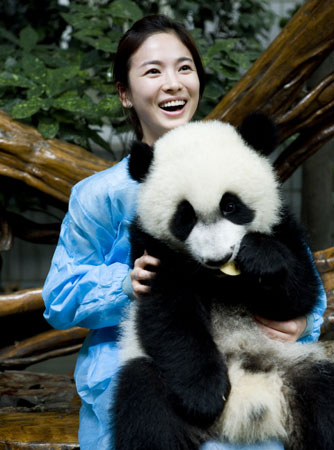 成都大熊猫基地方面表示:“去年因四川大地震,熊猫的另一个栖息地——卧龙基地被毁,因此正在募集重建基金,而这次宋慧乔担任爱心大使,所以希望能够得到中国和亚洲其他国家的帮助。”