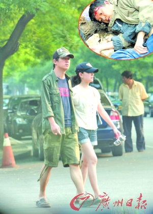 为了不让外人认出,潘粤明与董洁都将帽檐压得很低,两人十分悠闲地边走边聊。从行走状态上看,潘粤明已能行走自如,只是步履比较缓慢,董洁显得比较紧张,还不时看看潘粤明脸上是否有不适的感觉。当天董洁的左手中握着一卷褐色的物品,很像是医用绷带之类的东西,看样子是为潘粤明准备的。