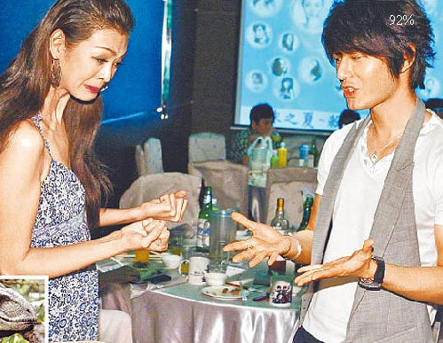 中新网7月23日电 偶像剧《泡沬之夏》前晚举行杀青酒,演员喝酒high翻天,完全顾不得形象,黄晓明被拱上台与何润东(Peter)大跳韩国团体Super Junior的《Sorry,Sorry》,还与林嘉绮划数字拳拼酒,她竟不顾名模形象突然露出《侏罗纪公园》里迅猛龙模样,玩得十分投入。唯一全身而退的是大S,但她也不好过,因拍杀青戏时,她被何润东撞到脖子扭伤,只能上下动,不能左右动。