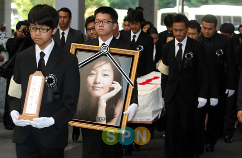 “朝鲜日报”消息,张真英的两个侄子分别手捧牌位和遗像,走在送灵队伍最前面。紧随棺材的母亲止不住悲痛的泪水,让人感到心痛。遗属和安在旭、车太贤、金亚中等圈内好友及参加遗体告别仪式的亲朋好友也在送灵队伍之中。