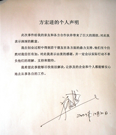 方宏进的声明字数并不多,全文为打印字体,在文末空白处,方宏进签上了自己的名字。一开头,方宏进就道歉,“此次事件给我的亲友和各方合作伙伴带来了巨大的困扰,对此我表示深深的歉意。”饱受争议的方宏进直言:“希望此事能够尽快依法解决,让涉及的企业和个人都能够安心地从事各自的工作。”