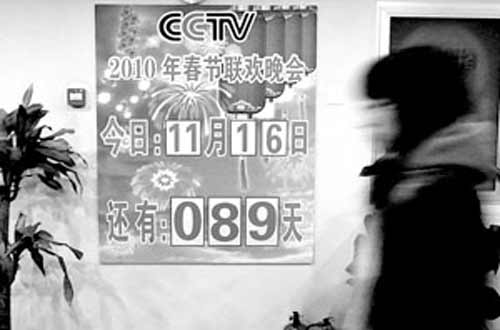 这个由红色灯笼、黄红相见的烟花装扮的倒计时牌,格外喜庆。昨天,倒计时牌上显示“CCTV2010年春节联欢晚会今日:11月16日 还有:089天”。