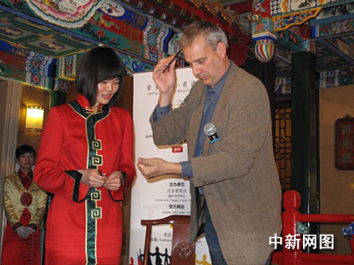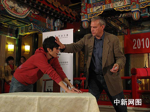 中新网11月25日电 昨天(24日),北京电视台2010年“环球春晚”正式签约美国著名魔术师大卫.威廉姆森仪式在北京全聚德烤鸭店举行。和因春晚一炮而红的刘谦一样,来自美国的大卫最擅长近台魔术,被誉为是“魔术盛典灵魂人物”。在签约仪式上,大卫以他风趣幽默的个人风格和在场的魔术爱好者过招,在观众眼前近距离地用扑克牌和顺手拿起的筷子展示了自己娴熟的手法。