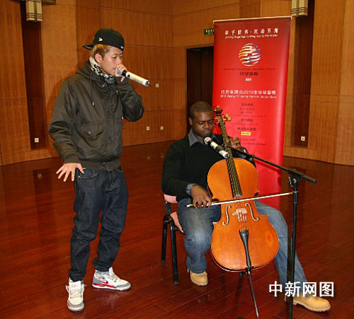 中新网12月10日电 昨日下午,北京电视台《环球春晚》的排练厅迎来了两位不同国际的特殊组合,来自美国的凯文和上海的虫二,他们用Beat-Box这种特殊的“口技”表演为在场观众献上了一份另类“大餐”。