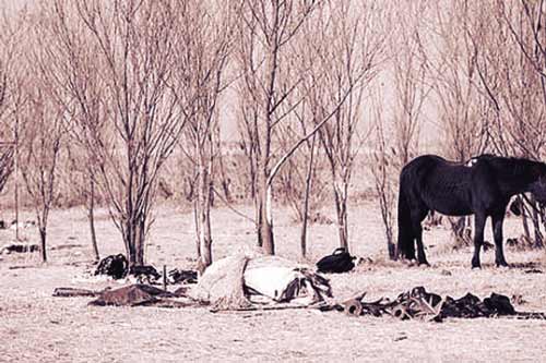 记者6日来到拍摄现场,发现一大片平整的湿地上异常热闹,十多匹高头大马正在不停地啃着野生红柳的树皮,约30多台各种车辆停放在湿地上,地上到处是垃圾和随手扔掉的黑白塑料袋……