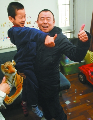 昨天上午,在本报记者和信报记者的陪同下,抱着一只玩具老虎的潘长江来到了位于南四环的韬宝家中。潘长江的到来让韬宝的父母格外欣喜感动,但以往只在电视里见过潘长江的小韬宝起初有些“认生”。不过,当他一眼看见潘长江手中的CD时,立刻兴奋得一跃而起,拿过CD就急着要播放。尤其当他听到《过河》的旋律时,更是兴奋地满地打滚,并模仿起潘长江在《过河》中的表演。