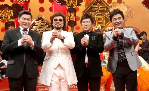 前天,4位“大腕级”的台湾“综艺大哥大”张菲、胡瓜、吴宗宪和澎恰恰首度同台,主持中视除夕特别节目“虎年旺旺庆团圆”。4人进棚录像,大伙笑称是“四大天王”。张菲和胡瓜师徒2人曾在去年莫拉克风灾后,共同主持公益慈善晚会,但4人同台主持还是首例。