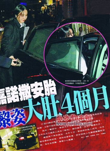 为生仔改名“黎珈而”的黎姿自成功“加儿”后,一直安心养胎甚少露面。昨日新上市的《壹周刊》又爆新料,虽然大部分时间都留家安胎,不过一向帮忙打理弟弟黎婴美容诊所生意的黎姿上月底也现身视察公司事务,全程都由司机接载。一身黑色长外套裹住的黎姿,在上车一刻因外套扬起露出白色打底衫,四个月的“大肚照”终掩不住,曝光了!而一向对黎姿疼爱有加的马廷强,听说自老婆怀孕后也变成紧张大师,减少出外应酬抽更多时间陪黎姿在家安胎。