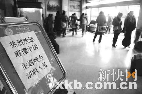 央视少儿频道表示,他们从未与该组委会有过合作,更谈不上播出其节目。被忽悠上“央视少儿春晚”的三百余名孩子只得在各领队老师的带领下黯然离开。图为某个代表队的几十名儿童带着沮丧在宾馆大堂等待回家。 (新快报)