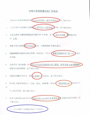 在清单里能看到的部分内容包括,“现场嘉宾桌摆放赞助饮料娃哈哈饮用水、蒙牛牛乳饮料,给予镜头展示”;“互动主持台立面设计上体现‘中国平安·平安中国’字样,给予镜头展示”;“春晚工作人员穿着乔丹赞助的服装,春晚现场给予镜头展示”;“佳能相机作为道具出现在歌舞《拍拍拍》节目中,相机及相机挂带上的logo在镜头中出现”;“小品节目《50块钱》中,鲁花食用油在面案或小桌上摆放,贴有企业Logo的围裙作为道具由演员使用,给予镜头展现”;“刘谦近景魔术节目中,使用汇源果汁作为道具,给予镜头展示”;“赵本山演出的小品节目中带有企业的logo的泸州老窖礼盒作为道具由演员使用,给予镜头展示。”