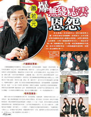 萧若元称,无线确实有很多发财机会,员工贪心也属正常,但最可恶的莫过于扼杀其他艺人,“以我公司的freeze组合来说,无线每年都要和她们签约,摆明不让你亮相其他电视台。这还不算,一场演出只有100元薪酬,freeze三人每人只有33块钱的酬劳。” (阿文)