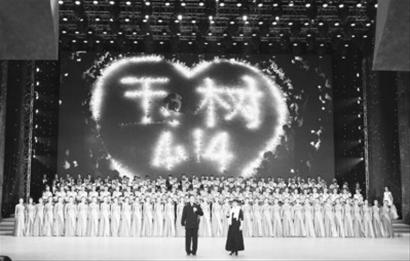 昨晚的《情系玉树,大爱无疆——抗震救灾募捐活动特别节目》赈灾晚会,以新闻事件为主线,串起文艺演出和募捐活动。晚会按照时间的顺序,穿插回放地震发生后的救援大事记,救援中的感人故事以及来自震区的报道,均出现在募捐现场。晚会一开始,在主持人白岩松的呼吁下,现场全体人士集体默哀三分钟,随后由百余位文体、曲艺界明星演唱了《我们众志成城》,王菲、那英等明星领唱。