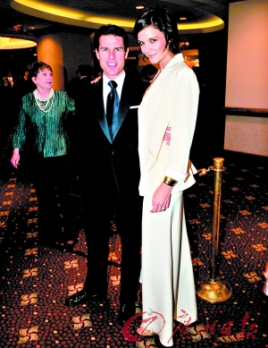 当晚的凯蒂·赫尔姆斯本就和阿汤哥差不多高,但是身穿白色晚礼服的凯蒂·赫尔姆斯选择了超高的高跟鞋,和阿汤哥站在一起,明显高出一头。当天有2000名美国精英和好莱坞明星参加这次盛宴。