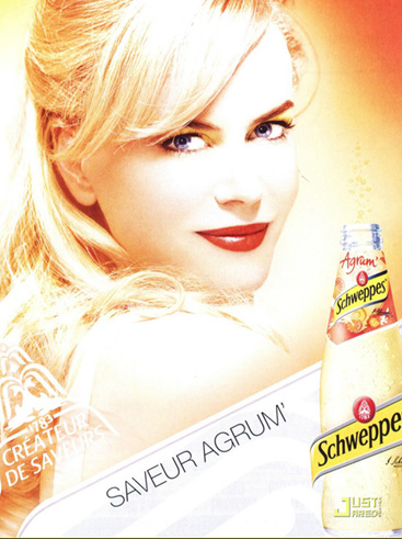 妮可·基德曼一头金发、蓝蓝的眼睛、修长的双腿,纯白的雪肌,鲜艳的红唇,代言最新的汽水饮料,海报上妮可·基德曼犹如女神降临,清纯的一尘不染,让我们看上一眼就舍不得移动双眼。