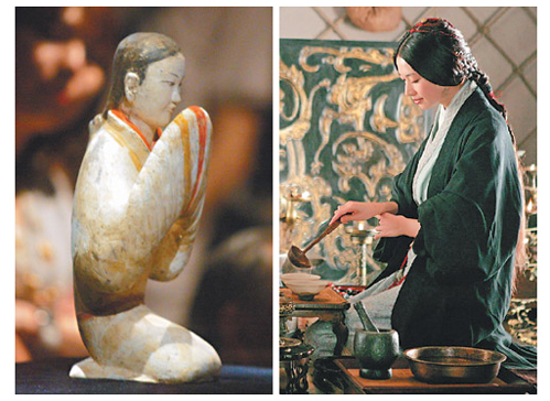 相较于历史博物馆“微笑彩俑”展里的跽坐拱手俑,叶锦添分析,林志玲在《赤壁》里的发型和服装都与拱手俑相仿,优雅的跽坐美姿让它化为永恒。