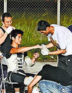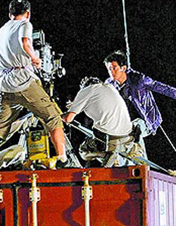 中新网7月29日电 郭富城前晚在港加紧拍《全城戒备》杀青戏,吊钢丝到2层楼高,再飞身跳到货柜车顶使出飞刀绝招,相当危险。