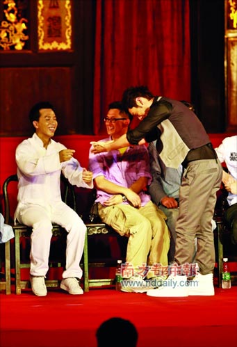 甄子丹当日以一身白色功夫装亮相,在随后的发布会,众多媒体见证了他一次收下黄晓明、释小龙和蒋岱言三位徒弟。“海选”出来的“小李小龙”蒋岱言现场耍双截棍,还虎虎生威地打了一套拳。之后,黄晓明等三人一起向甄子丹敬茶致礼,场面十分温馨。黄晓明说自己今后将多拍“打戏”,但有记者问:“你怎么一把年纪了才来学武术?”黄晓明笑言:“活到老学到老啦。男人应该都会点功夫,有强壮的体魄,才能保护女人!”