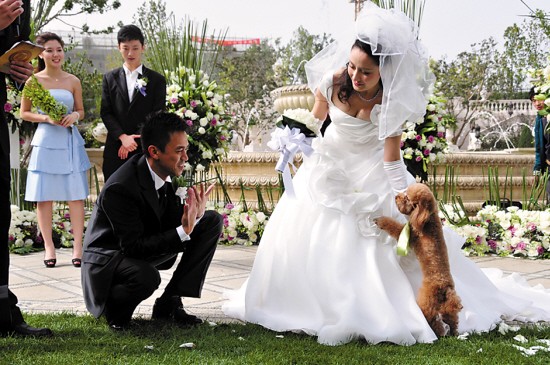 王学兵和孙宁别有新意地用他们的爱犬充当传递爱的使者,由爱犬将结婚戒指带到现场。交换结婚戒指后,王学兵与孙宁举起香槟向亲友祝酒。
