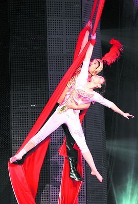 而整个节目的高潮,是在小沈阳换上露脐的盔甲装,演唱电影《神话》主题曲。除了卖力演唱,他还在舞台上玩了次“武侠”,手抓红绸缎,抱着女演员在工体馆上空飞来飞去,引得全场尖叫。