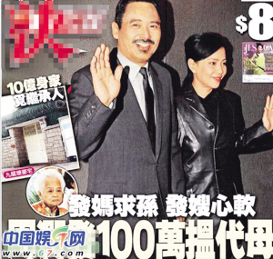 昨日有香港媒体报道,年届九旬的发妈陈丽芳希望发哥能够找代孕,为周家添后,一圆20多年的夙愿,同时也为周润发10亿元的家产“制造”继承人。据知,有人提出以一百万元代价,在内地寻觅优质代母,务求一击即中。