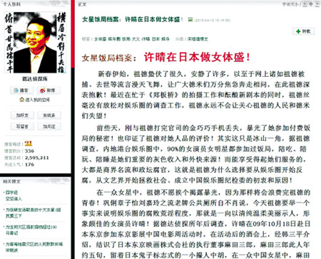 虽然接连遭遇两场官司败诉,但是宋祖德依然不改大嘴本色,在最近的一篇博客中,又“爆料”称许晴曾在日本做“女体盛”。根据宋祖德的叙述,许晴于2009年10月18日赴日本东京参加东京影展中国周活动时,在酒会上经中影集团董事长韩三平介绍,结识了日本东京映画株式会社的执行董事麻田三郎。宋祖德称,当天,许晴按照麻田三郎的要求,给他充当“女体盛”以换回他对影片《国父孙中山》的投资。