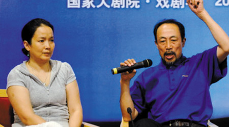 最激动的是饰演主角“培尔”的孙海英,打扮随意的他刚拿起话筒时语调十分平静,还被一旁的老伴吕丽萍调侃“说话像领导”。但谈到演《培尔·金特》的感受,他的语调顿时激动起来,更大叹“话剧已死”:“现在的戏剧都是在作假,互相说假话。人们都太浮躁,明明看不懂我们这部戏,只是看个热闹,到半场就回家了,还愣说看得懂———你明白个屁呀!什么都不明白!艺术不是因为你懂才来的,是因为不懂才来的,看不懂你就得学!我们不需要迎合大众,你爱来不来。”