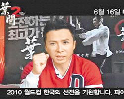 台湾《中国时报》消息称,《叶问2》远征韩国,甄子丹正在拍《关云长》无法前往,因此录了约2分钟的短片向韩国观众问好。他以韩文打招呼,接著说:“韩国是亚洲足球强国,希望韩国队在本届世界杯有优秀表现。”他还说自己是曼联队韩国选手朴智星的球迷。