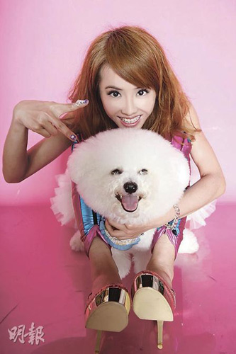 中新网5月22日电 香港《明报》报道,蔡依林(Jolin)新专辑《花蝴蝶》今日改版推出《华丽蜕变终极版》,Jolin特别拍摄全新30页写真集。拍照当天,她的爱犬Whoohoo见到主人不停摆出各种pose,它也凑热闹跑到镜头前抢镜,还露出比主人更灿烂的笑容。Jolin得意地说:“这是谁养的狗,怎么这么可爱!”Jolin又换上露肩T恤,配上脚上的紫黄双色丝袜极抢眼。