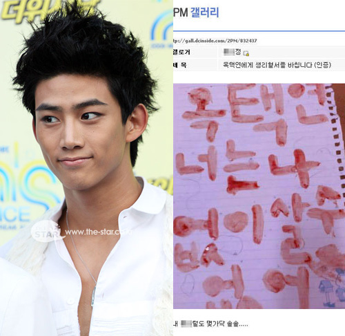 “朝鲜日报”消息,上月28日在社交网站DCInside的2PM图库中,一名会员上传了写有“玉泽演你没有我就活不了”的血书。一些网民看到后怀疑“是不是用红墨水写的假血书?”对此,上传这份血书的粉丝表示“我说到做到”,并公开了染血的内衣。