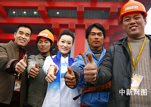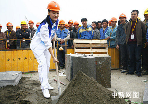 当天的天气有些阴沉,但是工地上依然是十分忙碌。而谭晶看到眼前的一切,被大家的热情所感动,并且来到工友们中间,与大家一起劳作,并给他们送水送纸巾。身穿志愿者服装的谭晶今天显得非常精神,也非常开心,并且亲自上阵体验了一把。