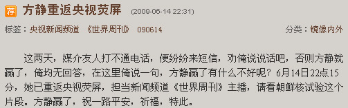 这两天,媒介友人打不通电话,便纷纷来短信,劝俺说说话吧,否则方静就赢了,俺均无回答,在这里俺说一句,方静赢了有什么不好呢?6月14日22点15分,她已重返央视荧屏,担当新闻频道《世界周刊》主播,请看朝鲜核试验这个片段。方静赢了,祝一路平安,祈福,特此。
