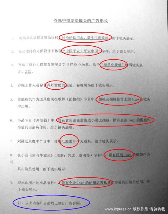 近日网络上曝光的一张题为“春晚中需要给镜头的广告形式”清单上共列出九条广告植入条目,包括饮用水、化妆镜、服饰、相机、酒等,外界十分关注的刘谦魔术、赵本山小品《捐助》、郭达蔡明的小品都有涉及。