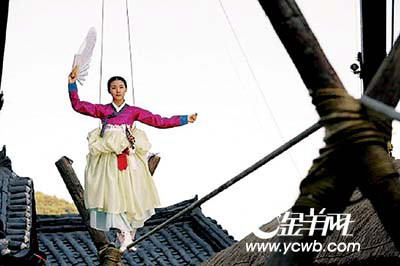 10月13日,河智苑在京畿道两水里拍走绳戏时,以轻巧的身姿站在3米高的绳索上。为了安全起见,她身上系着安全绳,以非常稳健的身姿成功拍摄了这场戏。走绳是作为妓女的黄真伊为了更好地展现舞姿,培养腹式呼吸和平衡感觉的训练之一。河智苑为了拍好走绳戏,一个月前便在家门口设置绳索苦练了。本月初她曾不系安全绳在高1.5米的绳索上用双臂保持平衡,高超技巧着实让摄制人员吃惊。(韩文)