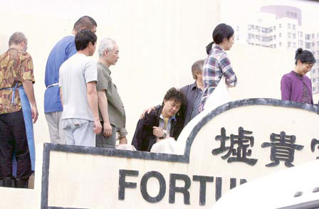 之后Eason跟千嬅要爬上屋顶拍摄列队敬礼镜头,千嬅要冒着寒风与Eason的替身试位,但她毫无怨言。正式拍摄时,千嬅见Eason病得没精打采亦不敢引他大笑,就位前还叫病得虚弱的他坐下休息。其它演员见Eason累得要不时倚靠石头休息,也不时对他特别照顾,为他披上外套以免再冷亲。至真正拍摄时,Eason即轻拍面额强装精神便投入大笑敬礼,结果同样以4Take完成戏分。