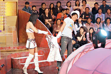 中新网4月12日电 据成报报道,庾澄庆(哈林)昨日担任电视节目《残酷一叮》嘉宾主持,六位参赛者当中,有“狂野豹妹”之称的刘丹,穿一身白色胶衣露腰短裙,一路唱《热情的沙漠》一路脱去衣衫,令哈林为之瞠目。