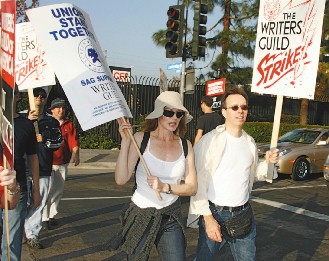中新网11月7日电 美国编剧协会发动大罢工,好莱坞影视圈都受冲击,电视尤其灾情惨重,包括“迷失”、“反恐24小时”等,新一季拍摄进度整个被打乱,刘玉玲新戏“Cashmere Mafia”更从原定本月底在美首播,变得上档遥遥无期。而“犯罪现场调查”女主角马格·海根伯格与艾美奖影后、《俏妈新上路》主演茱莉亚·刘易斯·德瑞菲斯,现身声援编剧,跟着他们高举抗议牌。