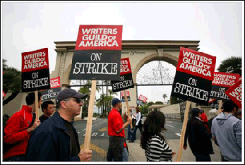最近,洛杉矶真是不太平。不久前,山林大火烧了一个多星期,至少造成15亿美元的损失。本月5日,好莱坞剧作家们又在工会的领导下,开始在全美国罢工。这是20年来的第一次剧作家罢工,在美国各界引起相当大的反响。这些平日深锁家中爬格子,难得露面的好莱坞剧作家们,一大早聚集在八大影业公司以及迪斯尼总部的摄影棚外,他们高举标语牌,声称这次对“电影暨电视制作人联盟”展开的罢工,将会是一场持久而代价昂贵的行动。电视屏幕上马上就有了反映,一些电视台开始播放老旧的内容。当然,作为同行,演员、主持人、脱口秀主持都非常支持编剧们,到现场慰问,并且在自己的节目中声援罢工。
