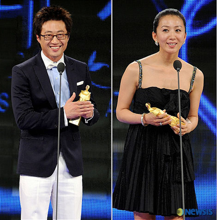 中新网1月2日电 据韩国NEWSIS报道,去年12月31日,在登村洞SBS公开大厅举行的“SBS演技大奖”颁奖典礼上,分别凭借《钱的战争》和《我男人的女人》共同荣获大奖的朴新阳、金喜爱正在发表获奖感言。