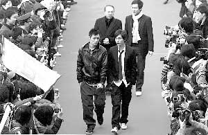 导演马楚成(左后)与谭俊彦(右后)走过红地毯,余文乐与陈坤则在前排风风光光地“谋杀菲林”。 记者 郭延冰 摄