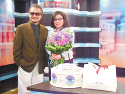 陈文茜(右)过生日,老友施明德祝福,中天电视送花和蛋糕庆祝。