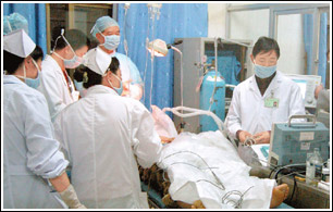 4月21日,腾冲县人民医院的医生在救治廊桥垮塌事故中的伤员。