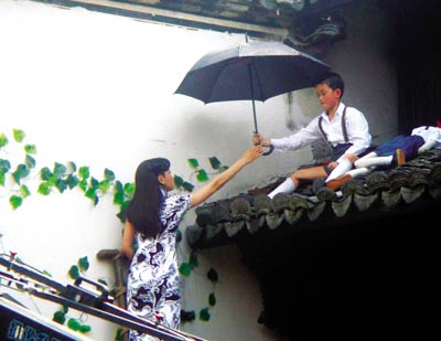 昨日的一场戏,是秦岚和剧中的儿子吴磊拍对手戏。由于天气炎热,秦岚说虽有洋伞遮阳,但妆还是化得很快。小演员吴磊当天很是不适,拍到最后竟然中暑,又吐又哭,忙坏了剧组的工作人员。按照剧情,秦岚要从屋顶上往下跳,尽管剧组为她请了替身,但为了追求真实和进度,秦岚亲自上阵,从数米高的地方往下跳,这场戏总算结束。